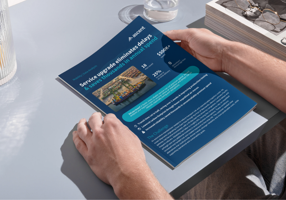 This mode shift delivered immediate gains. Transit time was cut in half, from 43 days to 25, while service reliability increased by at least 25%. Annual logistics spend on the single lane immediately dropped by over $500K, driven by reduced dependence on expedite air freight and lower inventory requirements, both of which supported the customer’s sustainability goals.